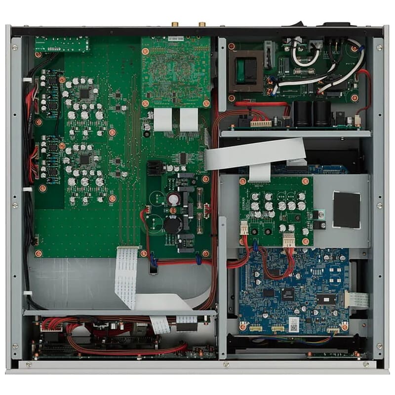 D-07Xでは、従来モデルD-06uに対し、電源トランスの容量を50%増大。各回路に独立したレギュレーターブロックを設置し、大容量ブロックコンデンサーを経由して電力を供給する、ラックスマン伝統の高慣性(ハイイナーシャ)電源環境を構築。クリーンで安定したパワーサプライを実現しました。