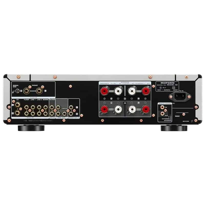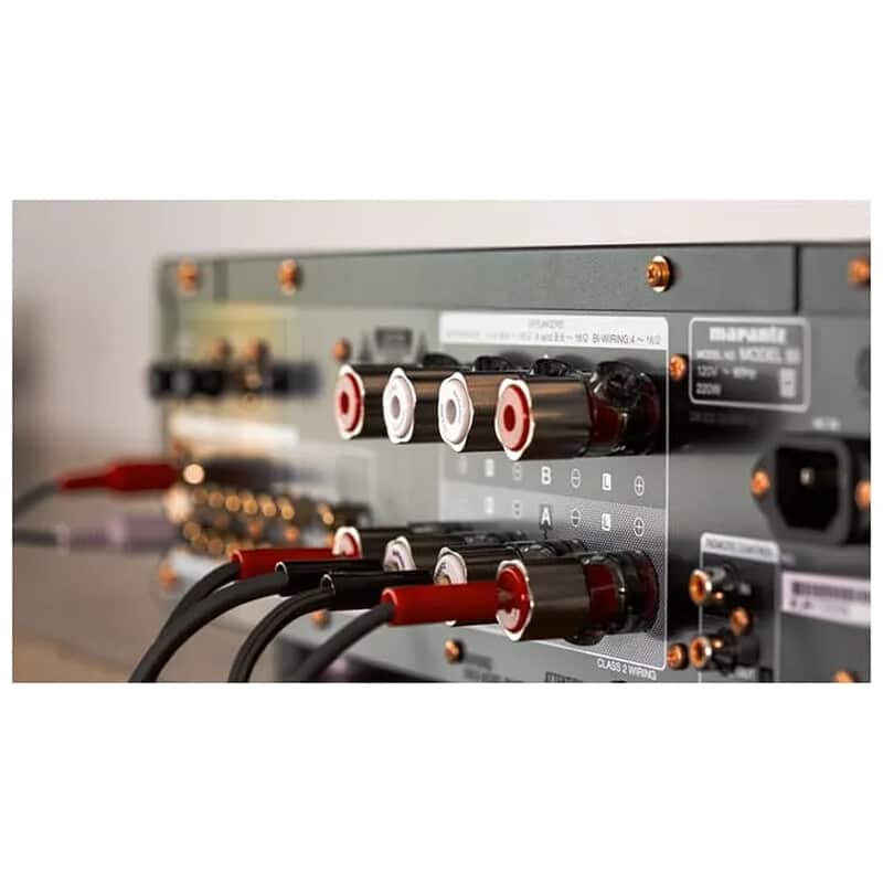 スピーカー出力にはマランツオリジナルのスピーカーターミナル(SPKT-1+)を装備。コア部は真鍮の無垢材から削り出された堅牢なもので、表面処理はリスニングテストの結果、従来のニッケル下地+金メッキの 2 層ではなく、厚みのある 1 層のニッケルメッキを採用しています。直径 4.5mm までのケーブルに対応しており、大型のスクリューで確実に固定することができます。また、Y ラグ、バナナプラグにも対応しています。