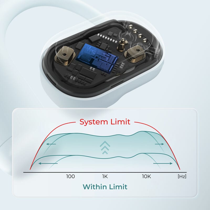 独自の音響アルゴリズムが音声信号をリアルタイムで解析し、イヤホンが無理なく再生できる範囲で自動補正。音量にかかわらず、豊かな低音からクリアな高音まで歪みなく再現します。従来のイコライザーのように無理に音域を持ち上げることがないため、音質の劣化を心配する必要もありません。