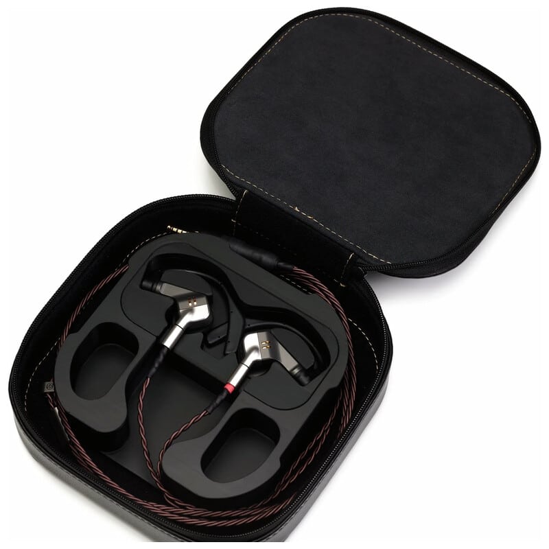 イヤホン本体と一緒に、ケーブルにクセがつきづらいように大きく巻いて収納・持ち運びできるよう設計されており、 蓋の内側に使用したウルトラスエードが、持ち歩いた際の傷を防止します。