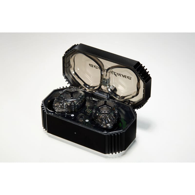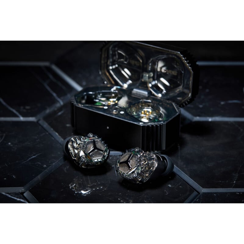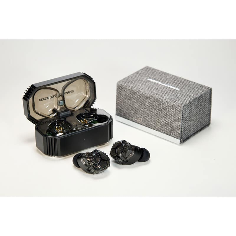 HSX One イヤホン本体は金属筐体(音響部)とポリカーボネート製ケース(ワイヤレスモジュール部)のレイヤリング構造です。アルマイト処理を施した CNC 切削加工の金属筐体にはドライバーユニットが組み込まれており、外観は落ち着いた印象のグラファイトと清澄感を強調したクリスタルの2つのバリエーションを用意しました。Acoustuneらしいメカニカルなデザインと合わせてスケルトンデザインをモダンに仕上げました。また、それらのデザインテーマは充電ケースとも共通しており、手に取るたびに統一感をお楽しみいただけます。