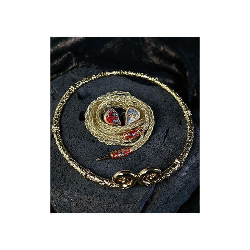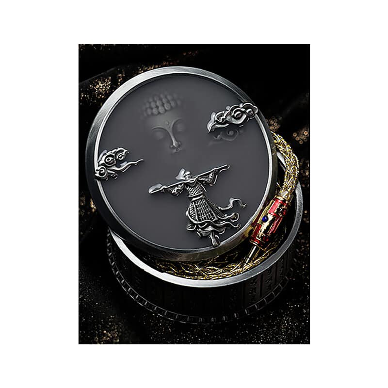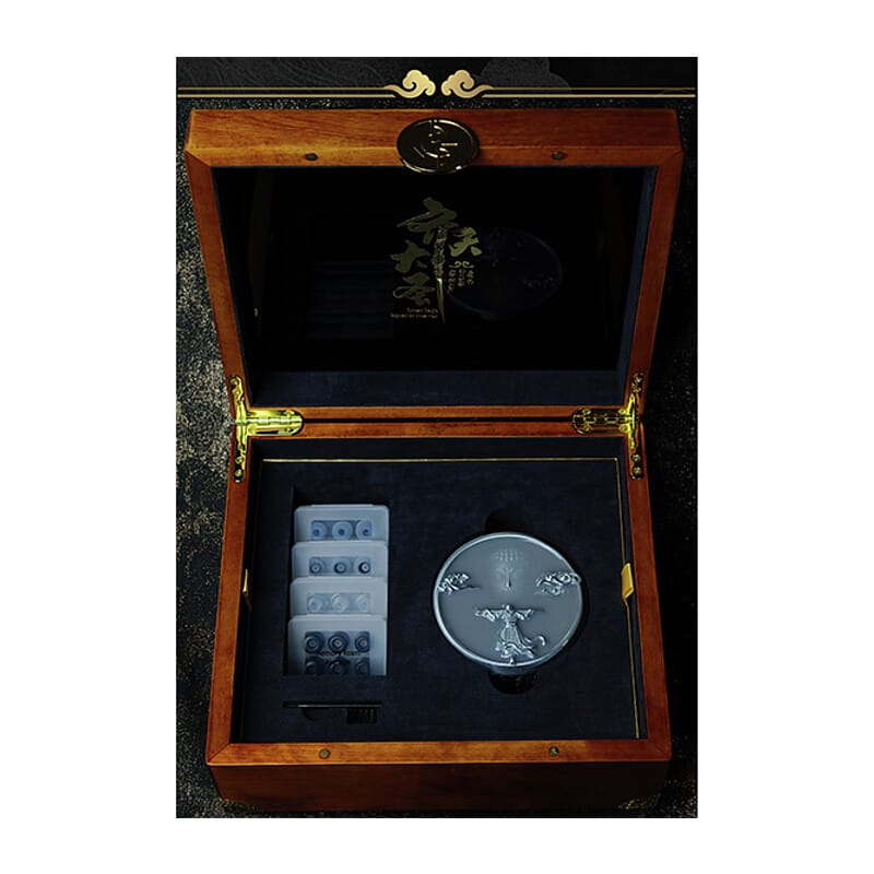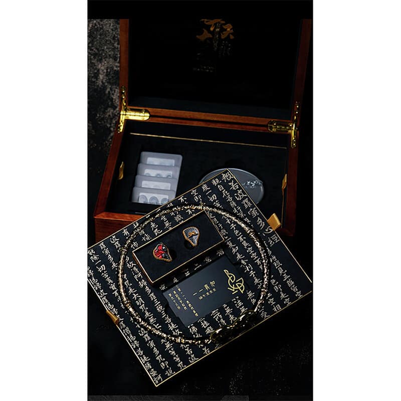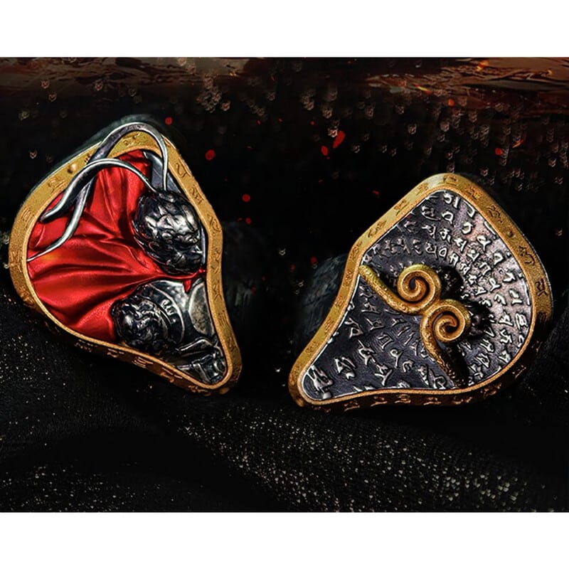 宝箱を思わせるパッケージデザインを採用。亜鉛合金製ケースに経文とレリーフを施し、工芸美を表現。フランネル内装によりイヤホンを丁寧に保護します。