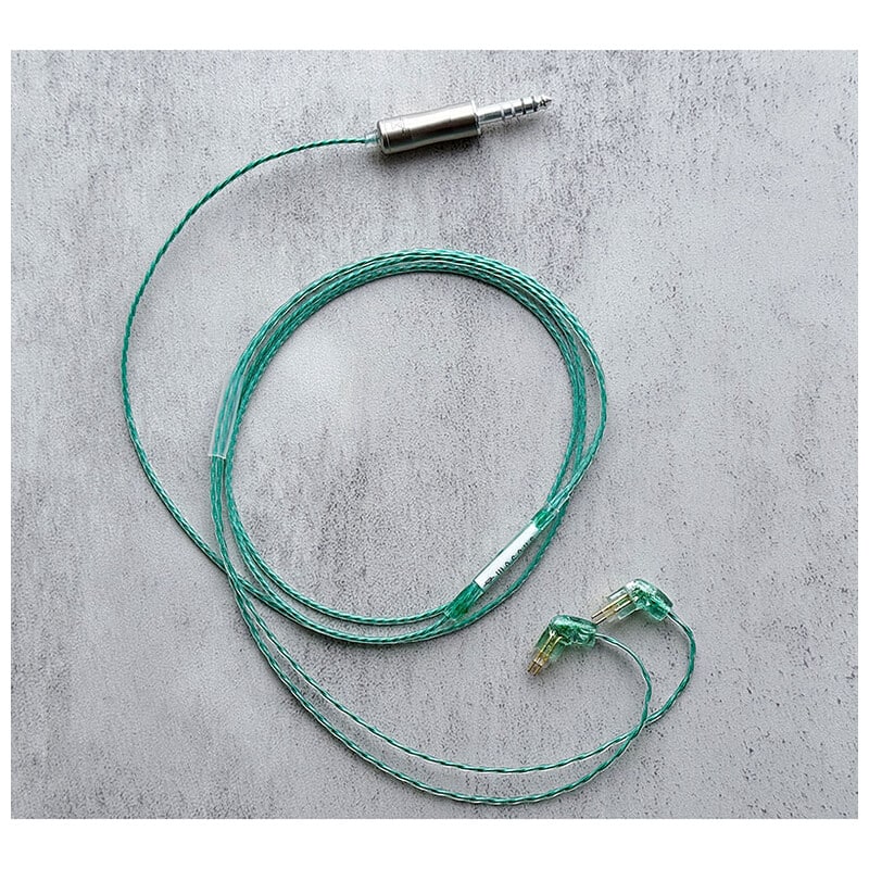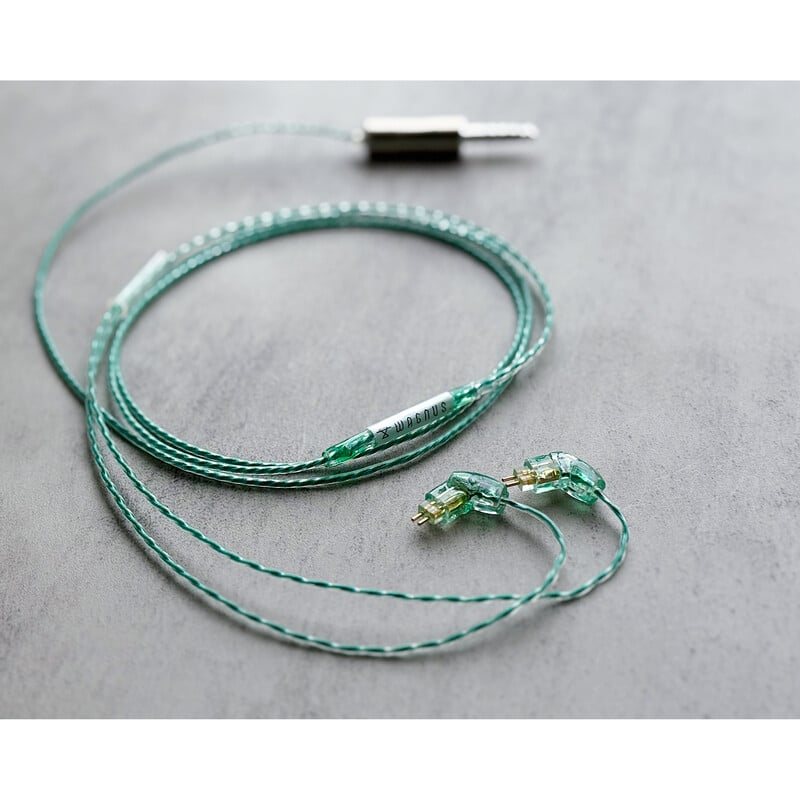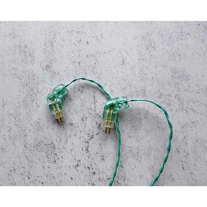 本作のケーブルデザインを全面的に押し上げるアートワークとして、ロゴ&イヤーコネクタ共に透明度も意識したエメラルドグリーンカラーを施し、さらに適切な小ぶりサイズ感のエメラルドも装飾いたしました。